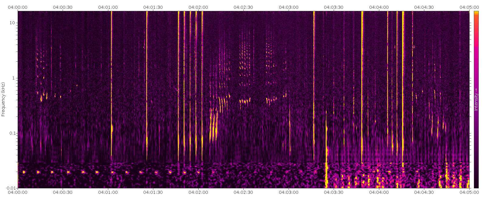 Below is a spectrogram (a visual representation of sound) of a fin whale (B. physalus) and a North Atlantic right whale (E. glacialis). The pulsed notes occurring at regular intervals around 20 Hz are produced by a fin whale, and the higher frequency, broadband pulses and upcalls are produced by a right whale. This was recorded near Grand Manan.